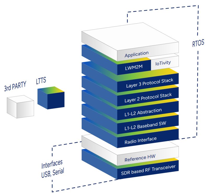 “nB-oN”, the NB-IoT solution from L&T Technology Services is a 3GPP Release 14 compliant Cat NB1 reference protocol stack (L1/L2/L3) for IoT low data rate devices. The typical use cases for this platform are Smart Metering (for Water, Gas and LWM2 Electricity), Smart Lighting, Asset Tracking, Smart Parking and Smart Agriculture. This reference solution is designed with low memory and low power footprint enabling seamless integration to custom target platforms. This reference platform uses commercially off the shelf Xilinx Zynq 7020 development board with Physical and Protocol Layer stack in dual core ARM Cortex A9 and SDR based RF transceiver. The soluation also has L1/L2/L3 ported on Cadence’ TenSilica Fusion F1 DSP and L2/L3 ported on ARM M4. This solution also provides the complete IoT Device Management capability using LWM2M (DM, FOTA, SOTA).