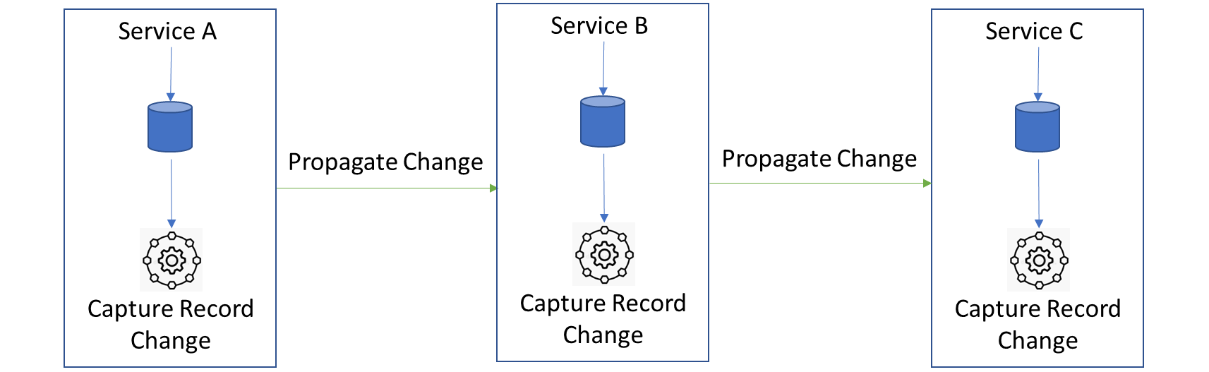 Das Grundprinzip bleibt im Kern gleich. Ein Dienst löst, nachdem seine lokale Transaktion in die lokale DB übertragen wurde, einen separaten Prozess aus, der einen Change Capture Record erstellt und den Change Capture Record an den nächsten Dienst weitergibt. Dieser Dienst nimmt den Change-Capture-Datensatz des vorherigen Dienstes auf, verarbeitet ihn, überträgt ihn in seine lokale DB und erstellt in einem separaten Prozess seinen eigenen neuen Change-Capture-Datensatz, den er an die nächste Gruppe von Diensten weitergibt.
