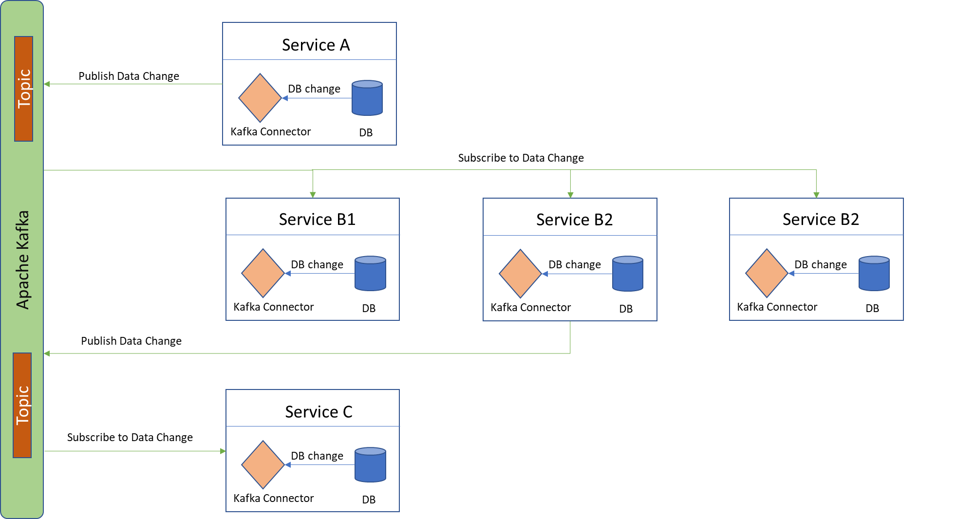 Verwendung von Kafka Connect und Apache Kafka: Die in einem Dienst erfassten DB-Änderungen können mit einem Kafka-Connecter verbunden werden, der die Änderungen an die verschiedenen Kafka-Themen weiterleitet, damit die Abonnenten sie konsumieren und umsetzen können.
